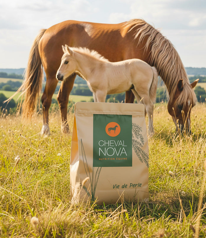 - Grâce à une formulation pauvre en amidon et en sucres, Cheval Nova Vie de Perle limite les pics glycémiques et insulinémiques, prévenant ainsi les troubles métaboliques chez la jument comme chez le jeune cheval.
